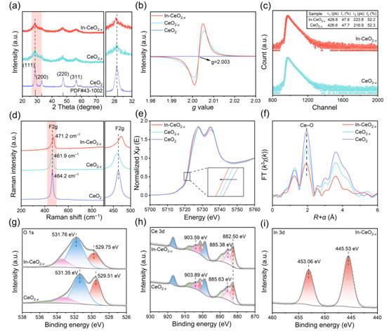 图2. CeO2、CeO2-x和In-CeO2-x的(a)XRD谱图和(b)EPR图谱。(c) CeO2-x和In-CeO2-x的PALS光谱。CeO2、CeO2-x和In-CeO2-x的(d)拉曼光谱、(e)归一化Ce L3边缘XANES和(f) FT-EXAFS。CeO2-x和In-CeO2-x的高分辨率(g) O 1s、(h) Ce 3d和(i) In 3d XPS光谱。