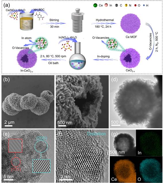 图1. In-CeO2-x的 (a) 制备过程示意图,(b,c) SEM图像,(d–f)HRTEM图像和 (g) STEM元素映射。
