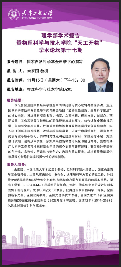 报告人简介:余家国,中国地质大学(武汉)教授、欧洲科学院外籍院士、国家杰出青年基金获得者,主要从事光催化、电催化、太阳燃料等方面的研究工作,针对传统II型异质结和Z型光催化机理热力学和动力学方面面临的问题和挑战,提出了梯型(S-scheme)异质结的新概念,为新一代光催化剂的设计与制备提供了新的视野。发表SCI论文700余篇,获得过国家自然科学二等奖,全国创新争先奖、全国优秀教师、全国先进科技工作者、全国先进工作者(全国劳模)和第35届花剌子米国际奖(2022年度)等荣誉。连续12年(2014-2025)入选全球高被引科学家名单。